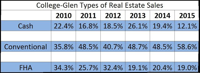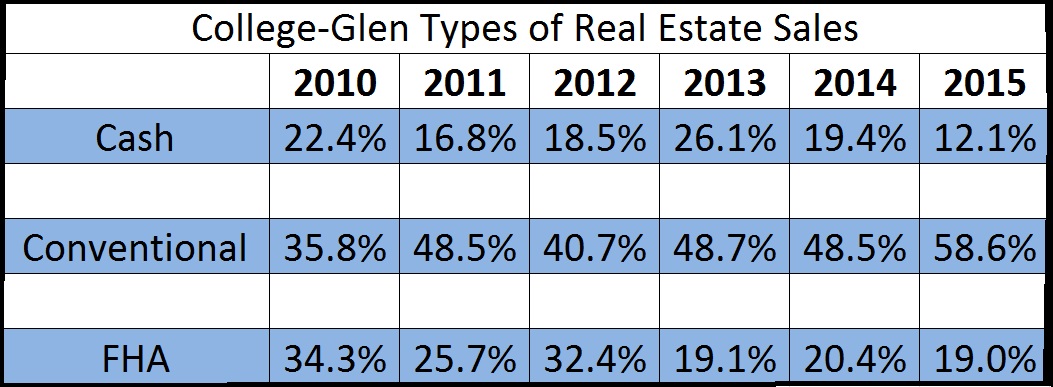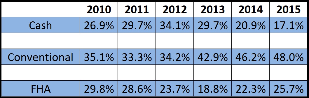 As you can see from the chart, Cash sales were at a high in 2012-2013. While FHA buyers were struggling at that time to get accepted offers and hit a low in 2013. Since then, the cash buyers have slowed down a bit and that has allowed more opportunity for the FHA buyers to purchase more homes as well as more Conventional loan products have become available in the past three years. SO you can see how more conventional sales are going through as well.
