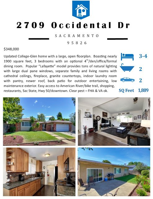 Updated College-Glen home with a large, open floorplan. Boasting nearly 1900 square feet, 3 bedrooms with an optional 4th/den/office/formal dining room. Popular “Lafayette” model provides tons of natural lighting with large dual pane windows, separate family and living rooms with cathedral ceilings, fireplace, granite countertops, indoor laundry room with pantry, newer roof, back patio for outdoor entertaining, low maintenance exterior. Easy access to American River/bike trail, shopping, restaurants, Sac State, Hwy 50/downtown. Clear pest – FHA & VA ok.