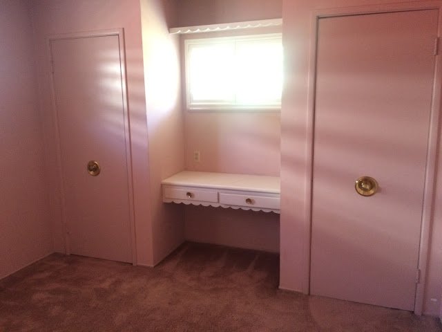 I was showing houses to a buyer client of mine a while back and we came across the “dated” property. The photos don’t do this room justice. THis room had bright PINK walls/doors/trim/everything. I needed my sunglasses on to not be blinded. And then to cap off the color and shag carpet, there were these massive door handles in the center of the closet doors. My clients passed on the house…not sure why.