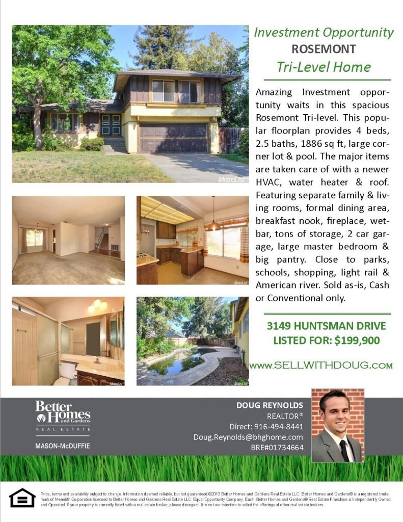 Amazing Investment opportunity awaits in this spacious Rosemont Tri-level.  This popular floorplan provides 4 bedrooms, 2.5 baths, 1886 square feet of living space, a large corner lot and a pool.  All of the major items are taken care of with a newer HVAC, water heater and roof.  The layout boast separate family and living rooms, formal dining area plus breakfast nook, fireplace, wetbar, downstairs half bath, tons of storage, two car garage, large master bedroom and big pantry.  Great location is close to parks, schools, shopping, light rail and American river. Being sold in as-is condition, Cash or Conventional offers only.
