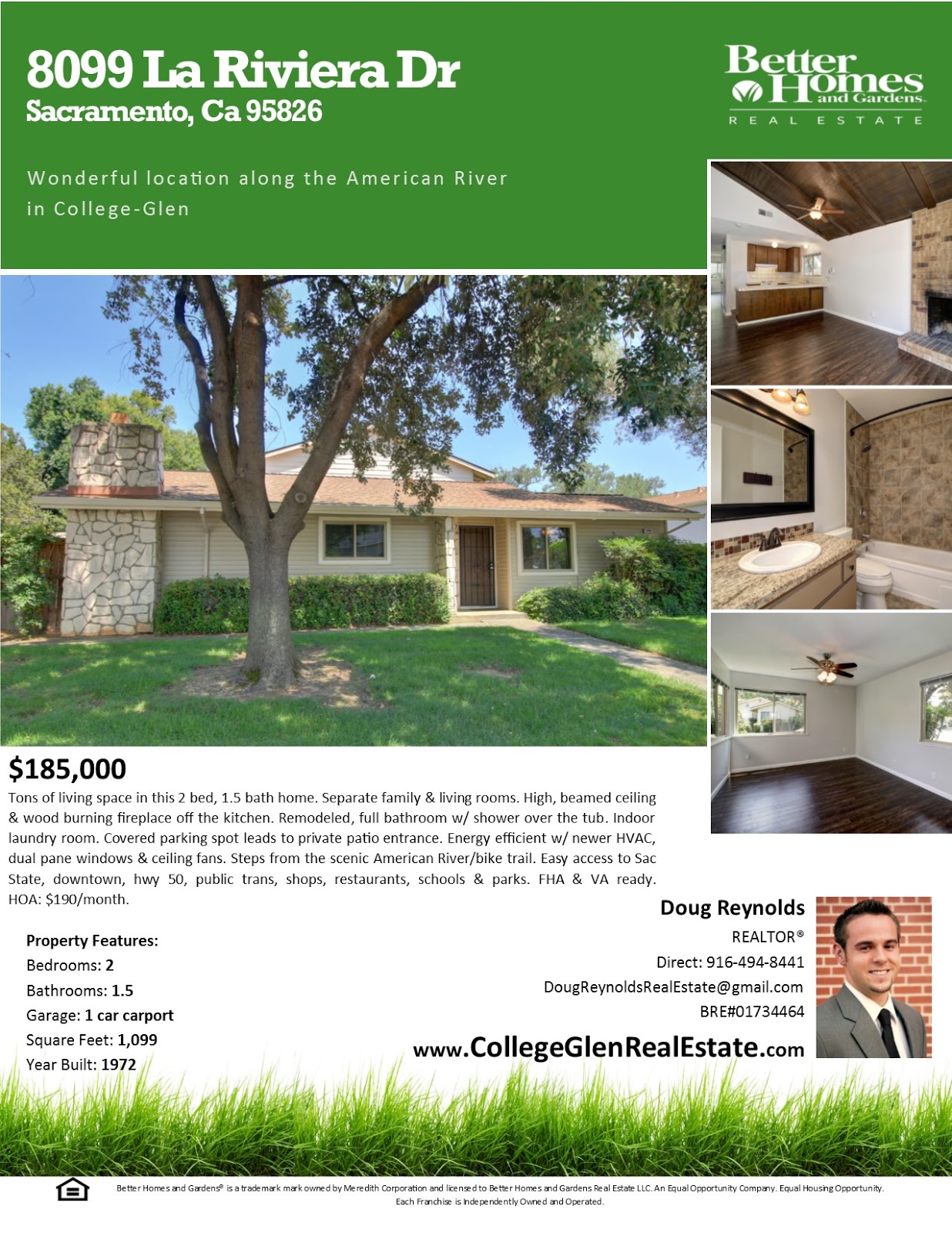 Tons of living space in this 2 bed, 1.5 bath home. Separate family & living rooms. High, beamed ceiling & wood burning fireplace off the kitchen. Remodeled, full bathroom w/ shower over the tub. Indoor laundry room. Covered parking spot leads to private patio entrance. Energy efficient w/ newer HVAC, dual pane windows & ceiling fans. Steps from the scenic American River/bike trail. Easy access to Sac State, downtown, hwy 50, public trans, shops, restaurants, schools & parks. FHA & VA ready.