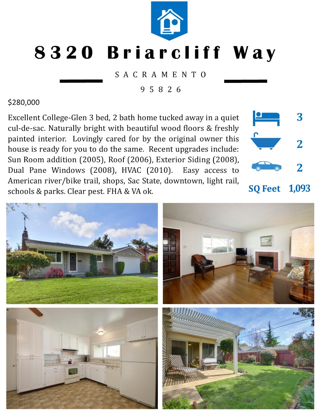 Excellent College-Glen 3 bed, 2 bath home tucked away in a quiet cul-de-sac. Naturally bright w/ beautiful wood floors & freshly painted interior.  Lovingly cared for by the original owner this house is ready for you to do the same.  Recent upgrades include: Sun Room addition (2005), Roof (2006), Exterior Siding (2008), Dual Pane Windows (2008), HVAC (2010).  Easy access to American river/bike trail, shops, Sac State, downtown, light rail, schools & parks. Clear pest. FHA & VA ok.