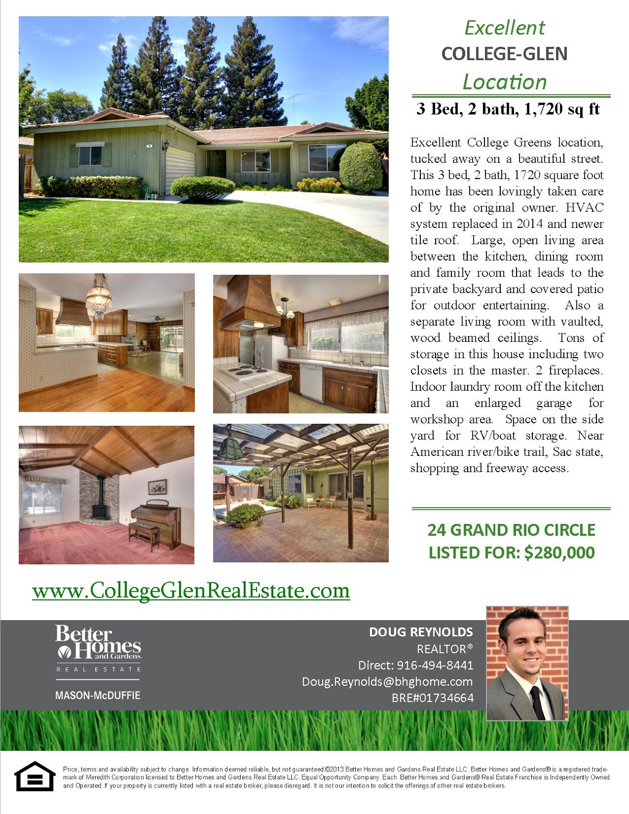 Excellent College Greens location, tucked away on a beautiful street.  This 3 bed, 2 bath, 1720 square foot home has been lovingly taken care of by the original owner. HVAC system replaced in 2014 and newer tile roof.  Large, open living area between the kitchen, dining room and family room that leads to the private backyard and covered patio for outdoor entertaining.  Also a separate living room with vaulted, wood beamed ceilings.  Tons of storage in this house including two closets in the master. 2 fireplaces. Indoor laundry room off the kitchen and an enlarged garage for workshop area.  Space on the side yard for RV/boat storage. Pick out your personal touches and call this home.  Near American river/bike trail, Sac state, shopping and freeway access.