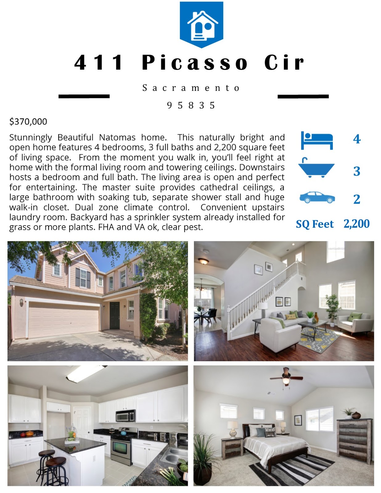 Stunningly Beautiful Natomas home. This naturally bright and open home features 4 bedrooms, 3 full baths and 2,200 square feet of living space. From the moment you walk in, you’ll feel right at home with the formal living room and towering ceilings. Downstairs hosts a bedroom and full bath. The living area is open and perfect for entertaining. The master suite provides cathedral ceilings, a large bathroom with soaking tub, separate shower stall and huge walk-in closet. Dual zone climate control. Convenient upstairs laundry room. Backyard has a sprinkler system already installed for grass or more plants. FHA and VA ok, clear pest.
